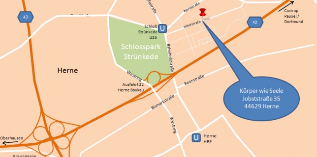 Dank der guten Autobahnanbindungen (A42 und A43) ist Herne auch sehr schnell aus Dortmund, Bochum, Recklinghausen, Castrop Rauxel und Gelsenkirchen erreichbar. Die Praxis liegt nur 5 min von der Autobahnausfahrt Herne Baukau bzw Herne Horsthausen an der A42 entfernt.